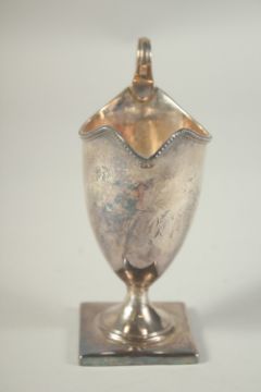 A GEORGE III SILVER HELMET SHAPED CREAM JUG.