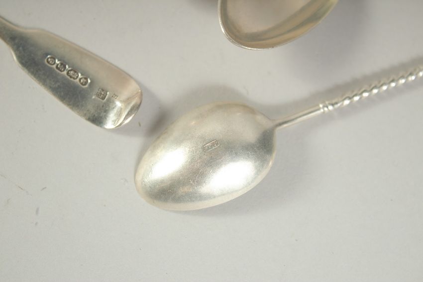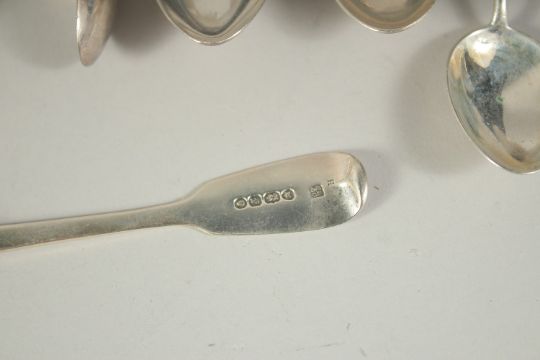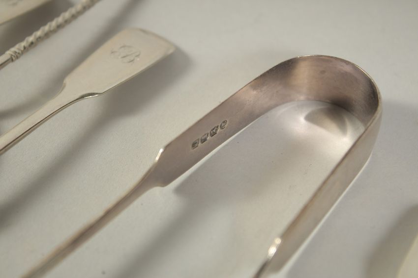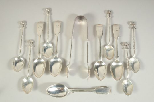 A SET OF SIX ELEPHANT FINIAL TEA SPOONS, FIVE FIDDLE PATTERN TEA SPOONS AND A PAIR OF GEORGE III SUGAR TONGS (12).