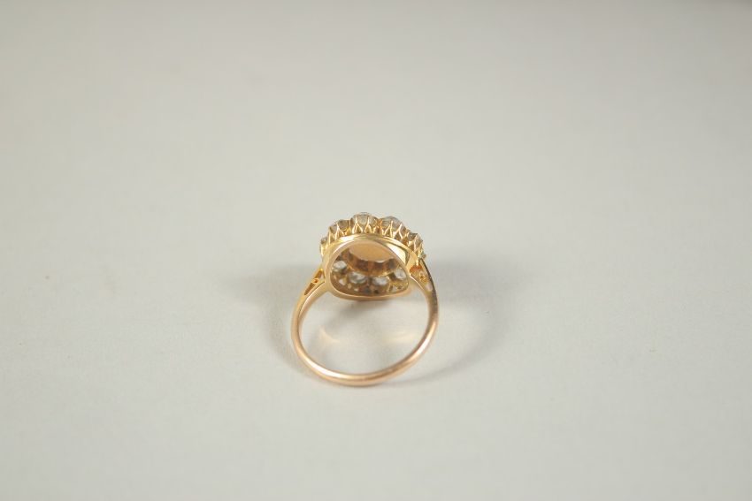 A GOOD OPAL AND DIAMOND CLUSTER RING with central opal and ten diamonds.