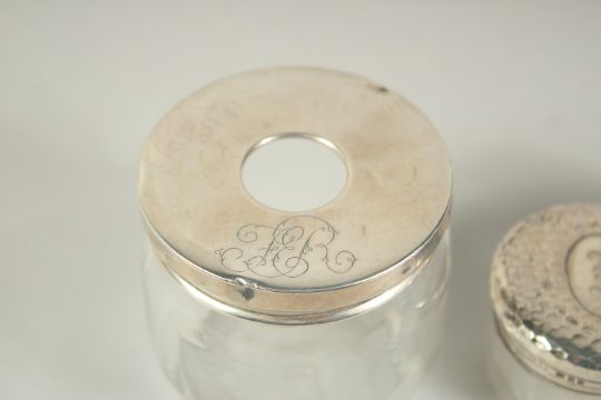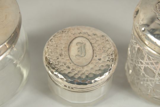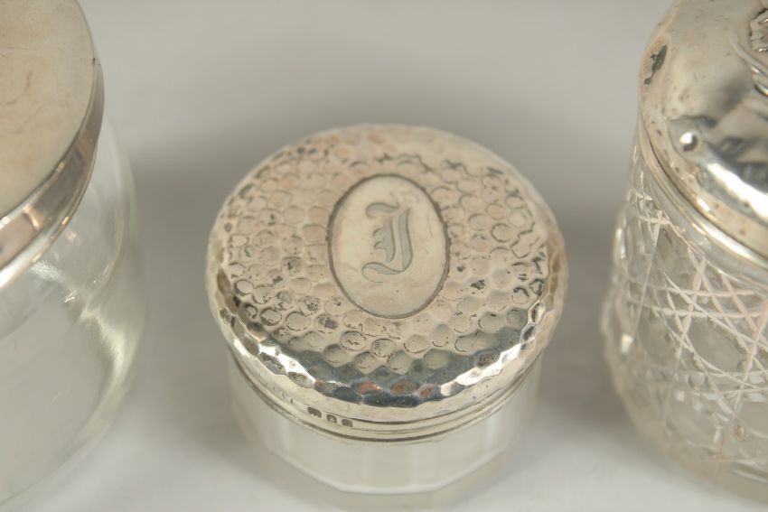 A GLASS AND SILVER RING TIDY, Birmingham 1907, and two silver top bottles, 1904 (3).