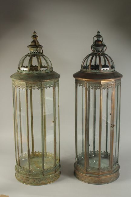 A LARGE PAIR OF COPPER ROUND LANTERNS.