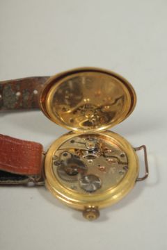 A GENTLEMAN'S 18CT GOLD HALF HUNTER WRIST WATCH on a leather strap.