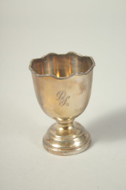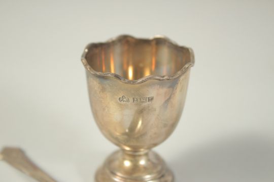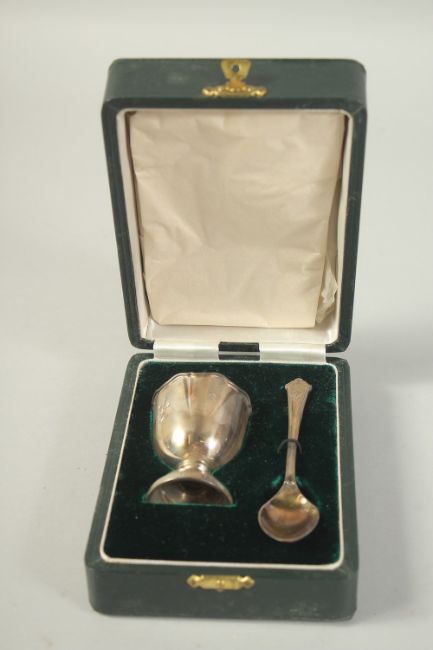 A CHRISTENING EGG CUP AND SPOON in a case.