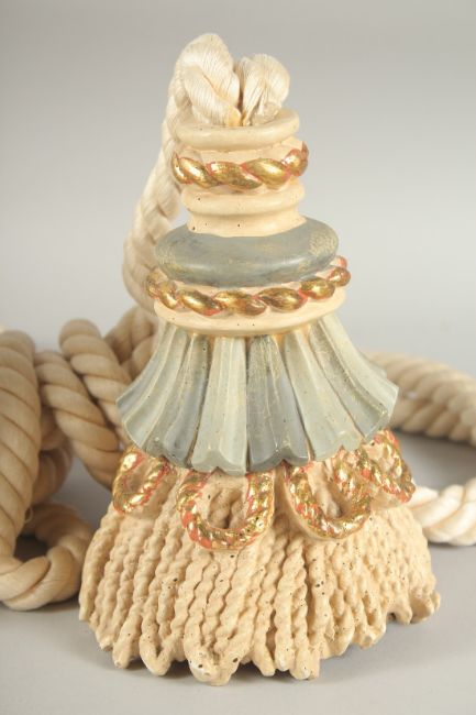 A GOOD PAINTED AND GILDED WOODEN CURTAIN TIES.