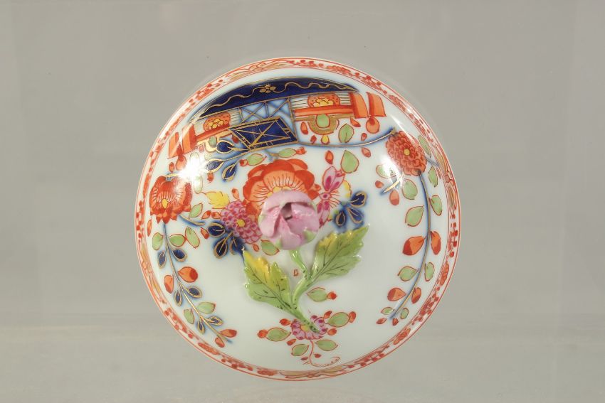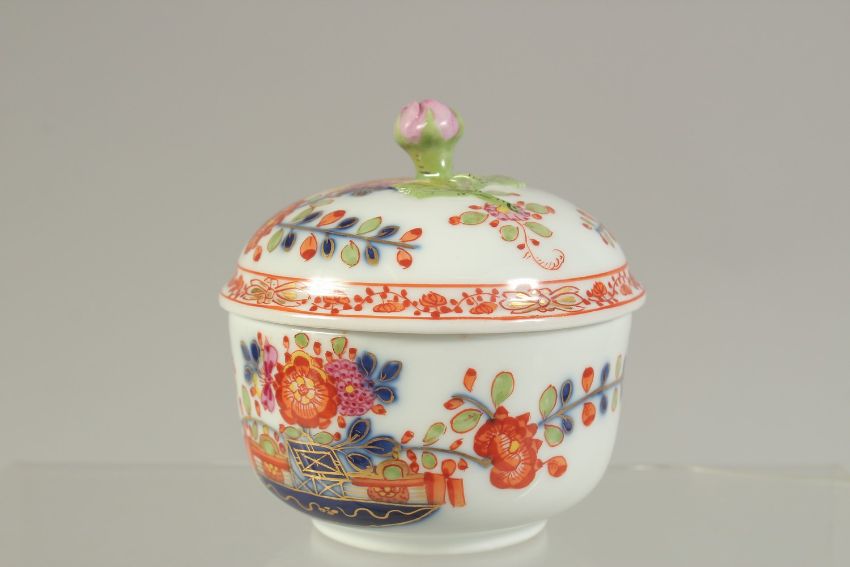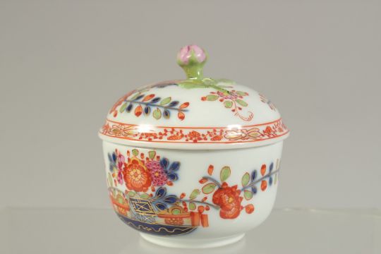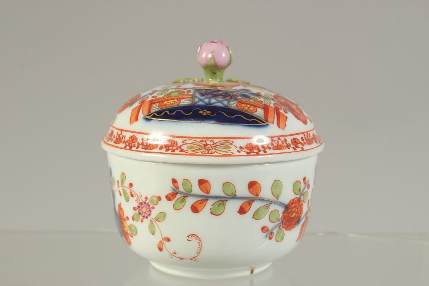 A MEISSEN CABARET SUCRIER AND COVER, painted in kakiemon style, crossed swords in blue.