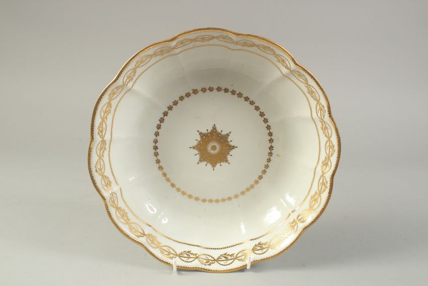 AN 18TH CENTURY DERBY JUNKET DISH decorated with ornate gilding, puce mark, pattern 61.