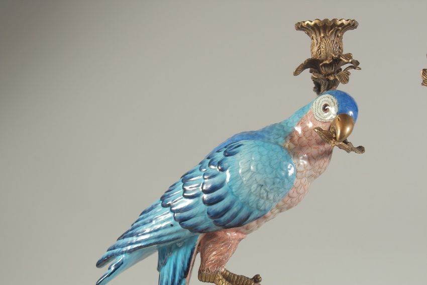 A PAIR OF LIGHT BLUE PARROT CANDLESTICKS on rustic bases.