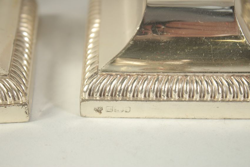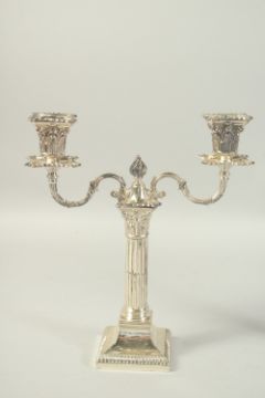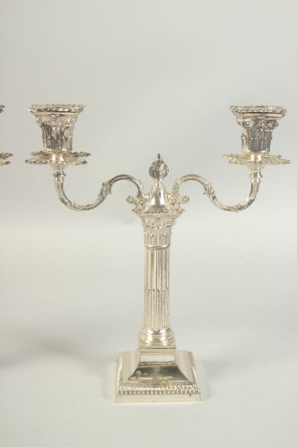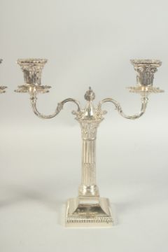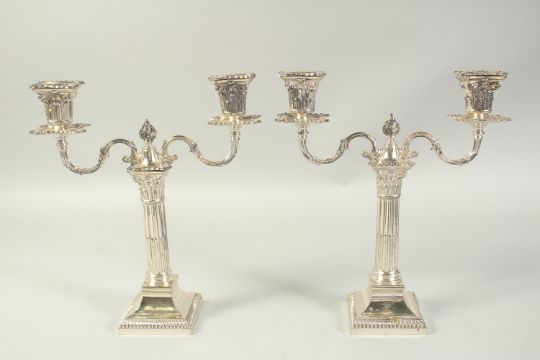 A GOOD PAIR OF TWO BRANCH SILVER CANDLESTICKS with coloums on square bases. 12ins high.