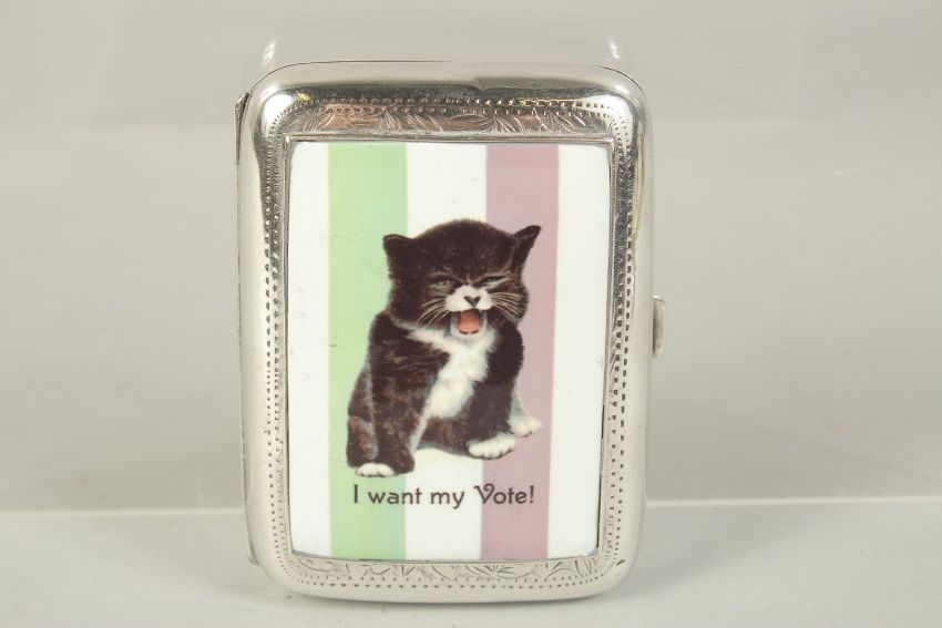 AN EDWARD VII SILVER CIGARETTE CASE with an enamel of a suffragette cat "I want my vot".