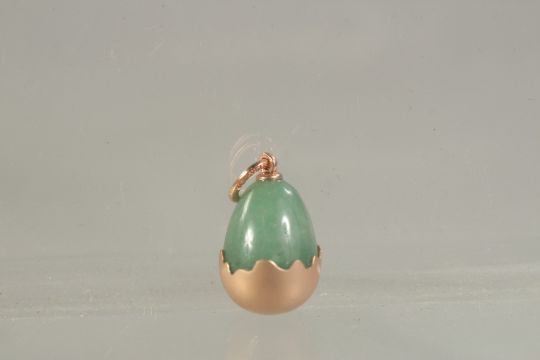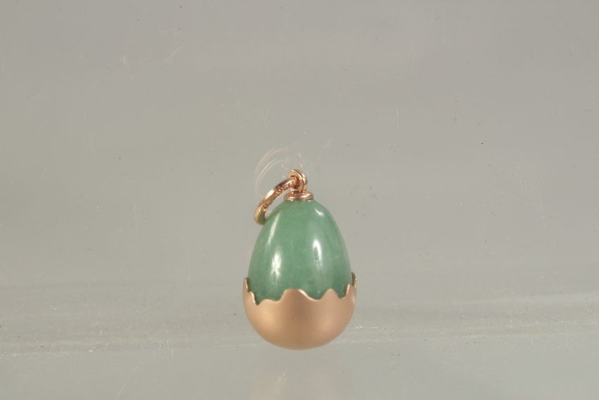 A 14CT GOLD RUSSIAN JADE EGG PENDANT.