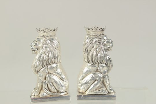 A PAIR OF SILVER PLATED ROYAL LIONS SALT AND PEPPERS.