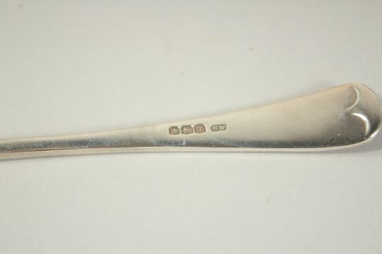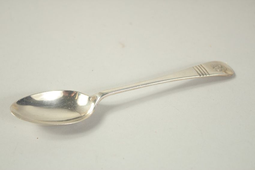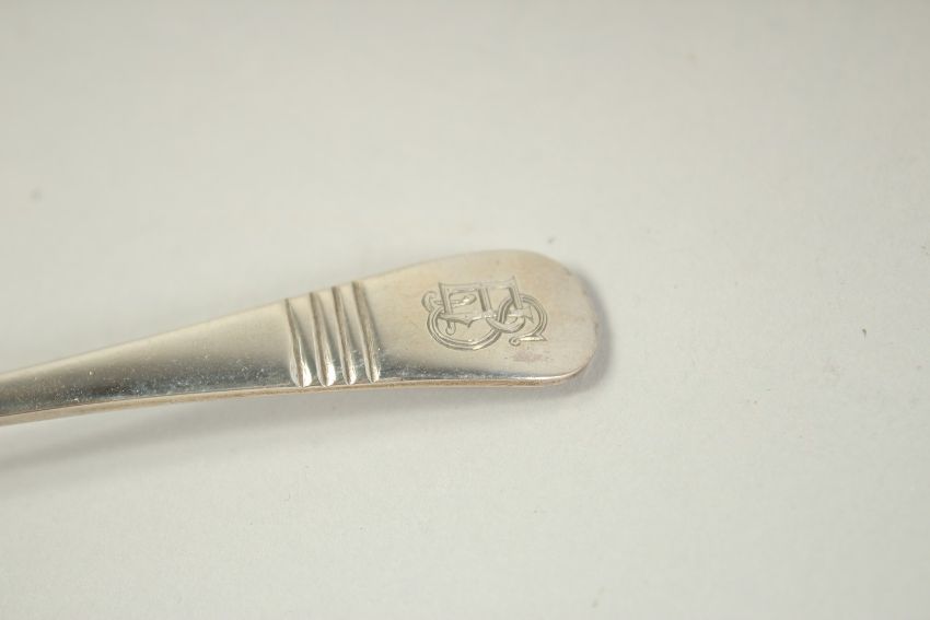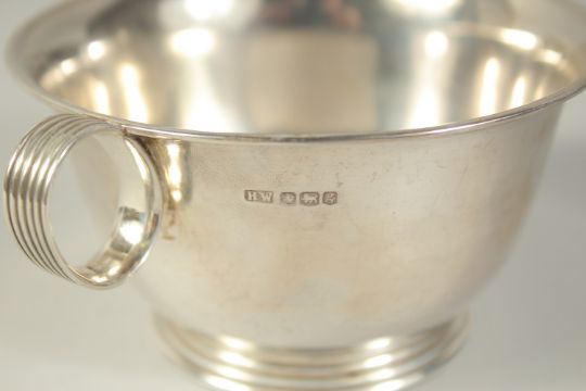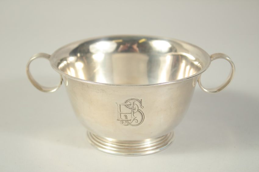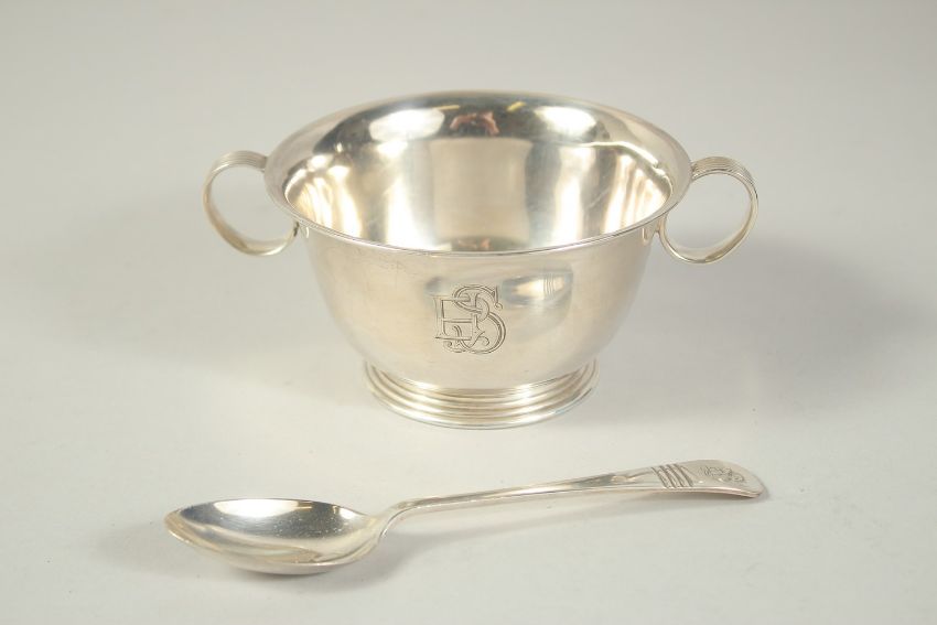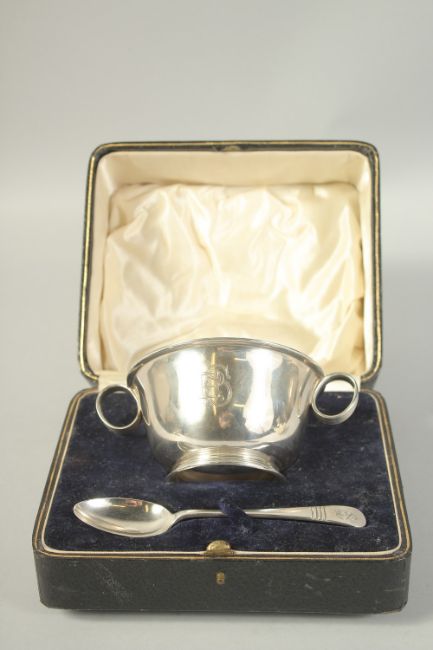 A TWO HANDLED CIRCULAR SILVER PORINGER SPOON in a fitted case.