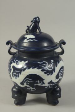 A CHINESE SACRIFICIAL BLUE TRIPOD CENSER AND COVER, the body with incised white dragons.