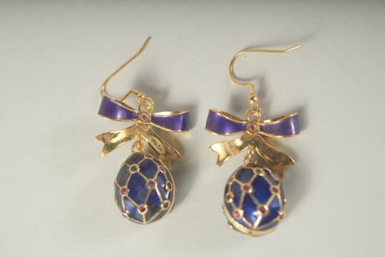 A GOOD PAIR OF RUSSIAN SILVER AND BLUE ENAMEL EGG EARRINGS with bow.