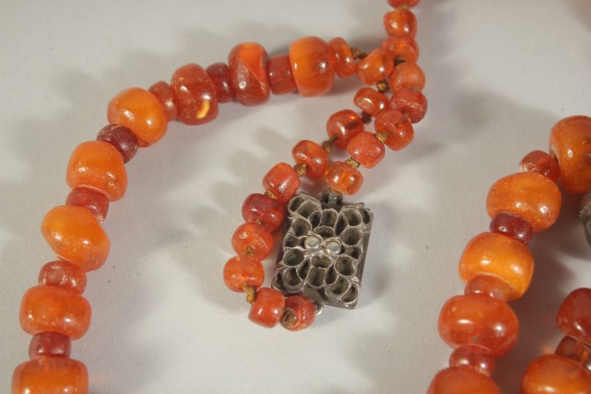 A GOOD ISLAMIC AMBER AND SILVER NECKLACE.