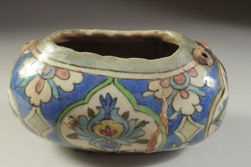 AN UNUSUAL PERSIAN QAJAR GLAZED POTTERY KASHKUL BEGGER'S BOWL, 23cm wide.