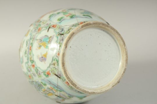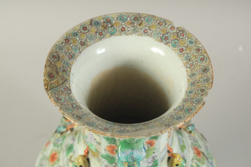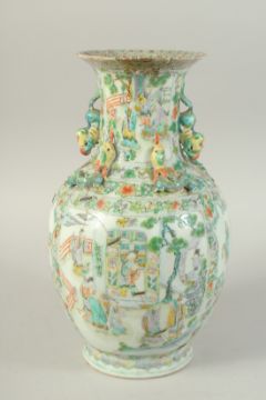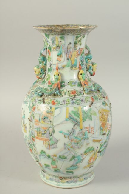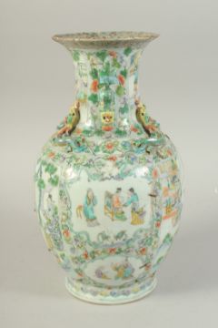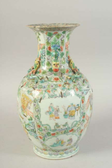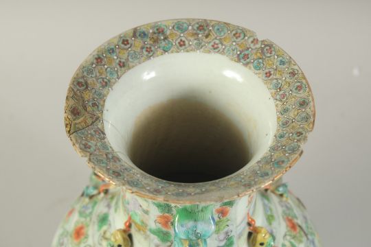 A CHINESE FAMILLE VERTE PORCELAIN VASE, painted with panels of figures, the neck with moulded chilong and foo dog handles, (staple repair), 37cm high, (af).
