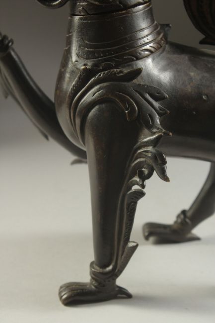 A VERY FINE AND RARE POSSIBLY INDIAN DECCANI BRONZE DRAGON SHAPED AQUAMANIAL EWER, with removable head, ewer pours from the raised claw, 26cm high.