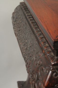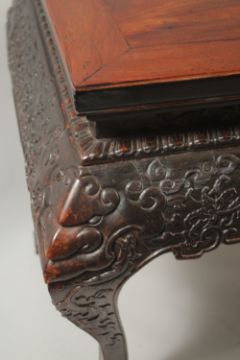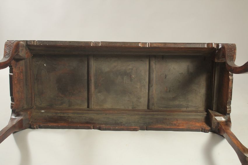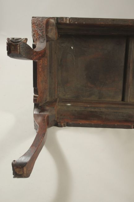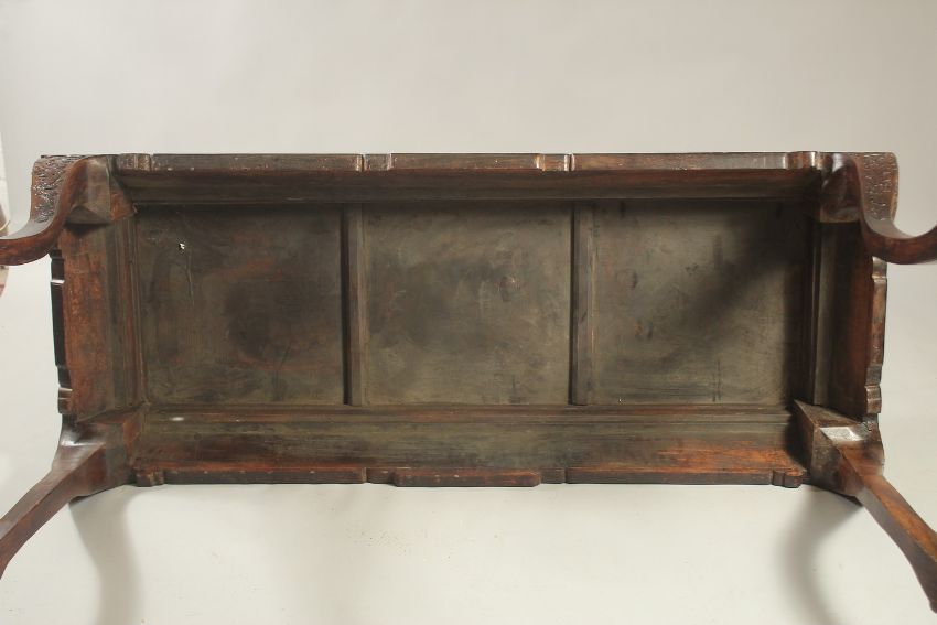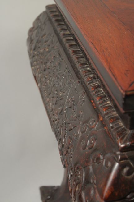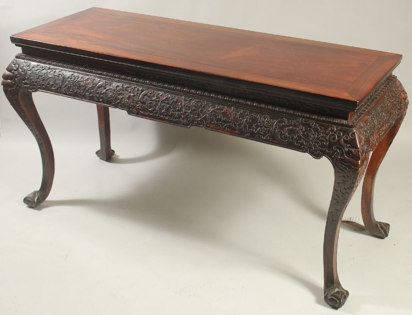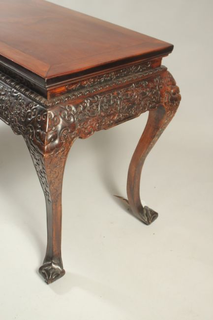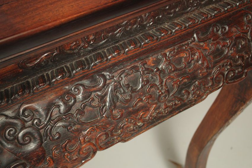 A VERY FINE 19TH CENTURY CHINESE HUANGHUALI ALTER TABLE, the frieze carved with foliate designs and ruyi, the four curving legs terminating with carved stylised feet, 170cm wide, 90cm high, 70cm deep.