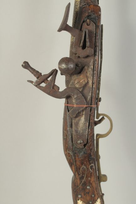 AN EARLY 20TH CENTURY NORTH AFRICAN MOROCCAN BONE AND WHITE METAL INLAID MUSKET, 160cm long.