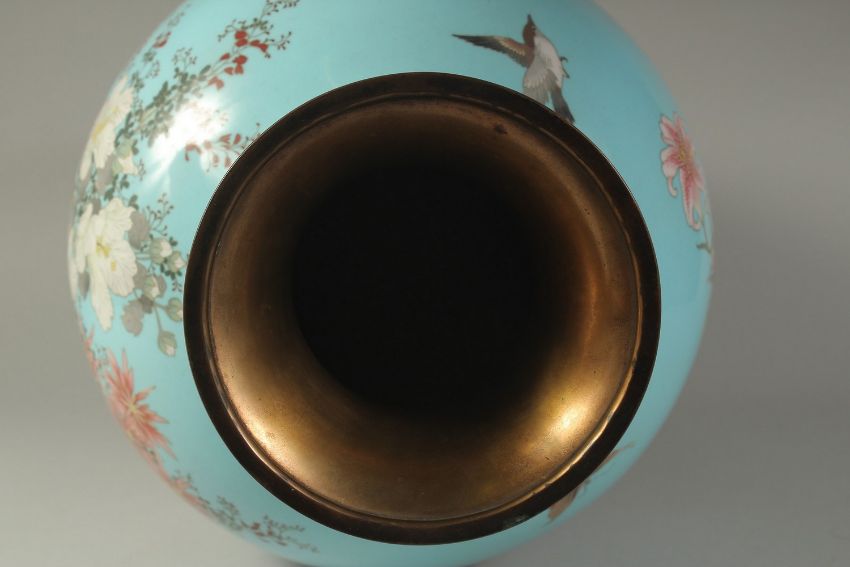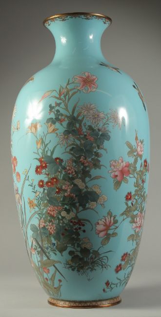 AN EXCEPTIONAL LARGE JAPANESE MEIJI PERIOD POWDER BLUE CLOISONNE VASE, with a large spray of very fine floral decoration of vibrant enamels and intricate wirework -further decorated with birds and butterfly, 62cm high.
