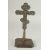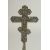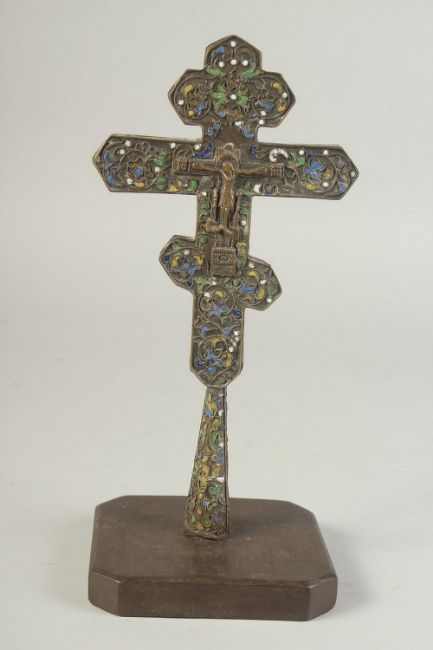 A FINE 18TH CENTURY GREEK OR RUSSIAN ENAMELLED WHITE METAL CROSS, 26cm high, on a later wooden base.