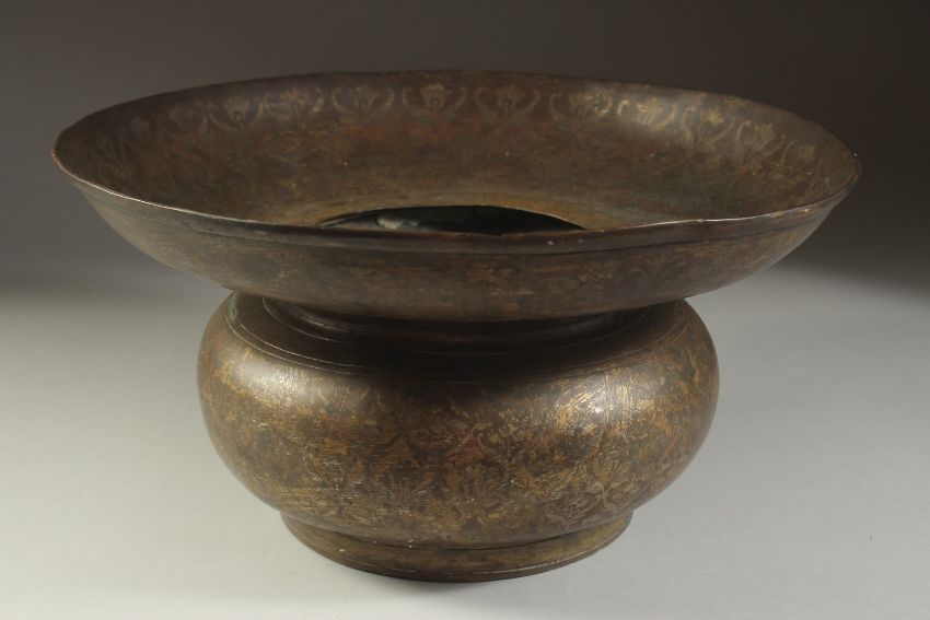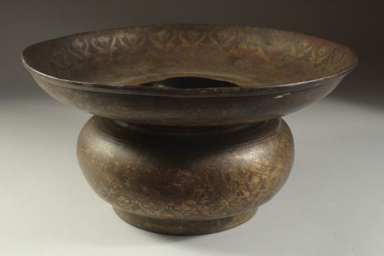 A FINE INDIAN BRASS OR BRONZE BASIN, with silvered floral motif decoration, 34cm diameter.