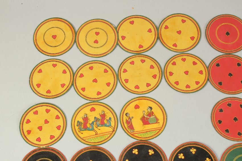 A FINE 19TH-20TH CENTURY INDIAN LACQUERED AND PAINTED BOX OF CIRCULAR PLAYING CARDS, box inscribed, 10cm x 7cm, 10cm high.