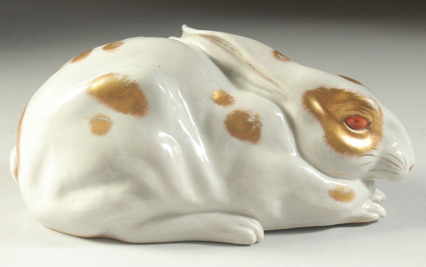 A JAPANESE KUTANI PORCELAIN HARE, with gilded patches and painted red eyes, made in Japan mark, 22cm long.