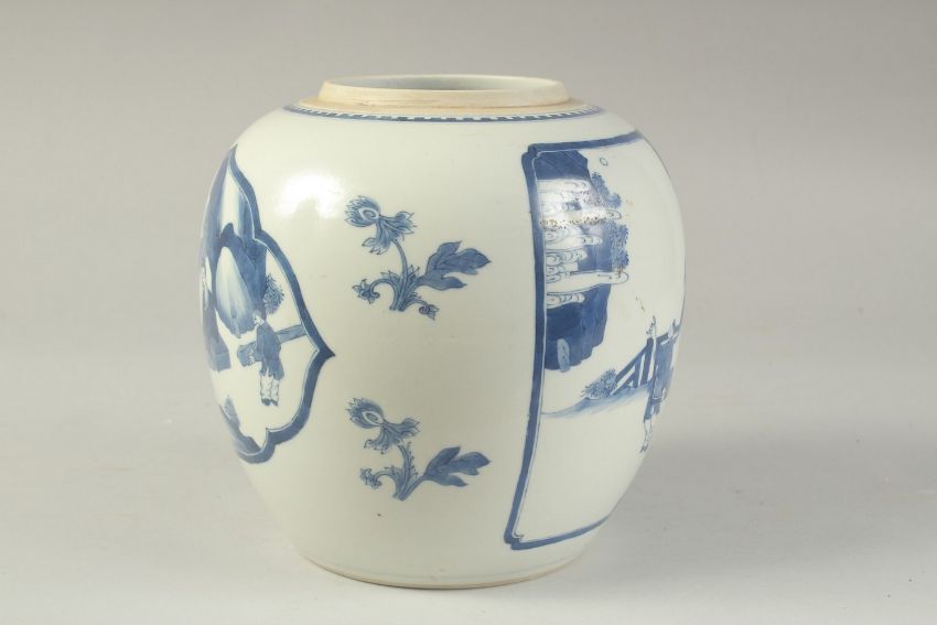 A CHINESE BLUE AND WHITE PORCELAIN JAR -possibly Kangxi period, decorated with two panels depicting various figures in outdoor settings, 20cm high.