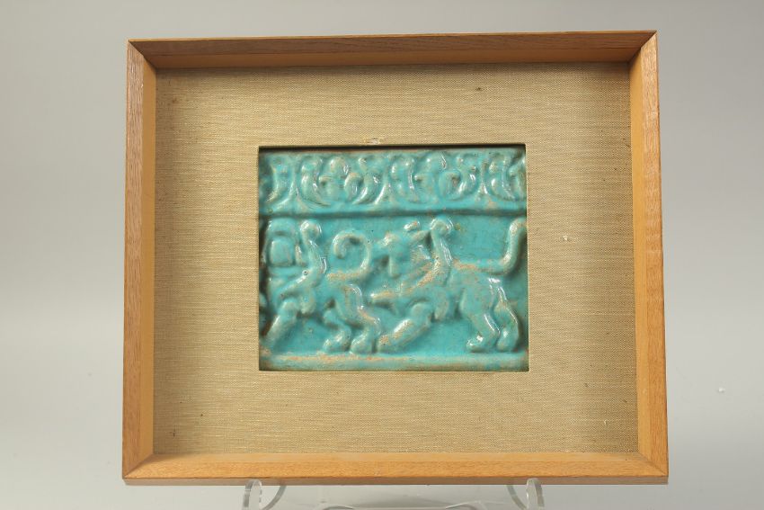A 12TH CENTURY KASHAN TURQUOISE GLAZED POTTERY TILE, with relief decoration depicting lions/beasts, inset with a frame, tile 17cm x 21cm.