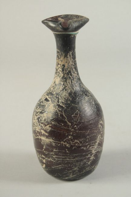 A RARE EARLY ISLAMIC OR POSSIBLY ROMAN AUBERGINE GLASS JUG, 16cm high.