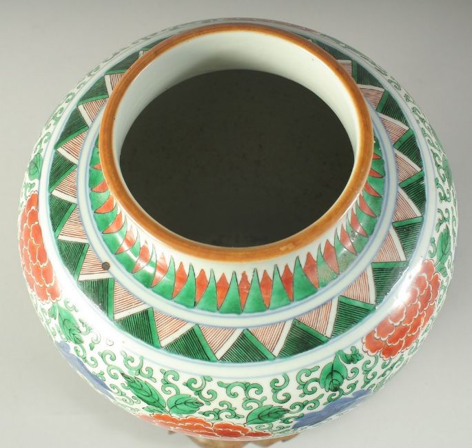 A FINE AND LARGE CHINESE POLYCHROME PORCELAIN JAR, painted with large flower heads in red amongst scrolling vine and underglaze blue leaves, together with a carved hardwood stand, jar 28cm high.