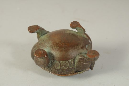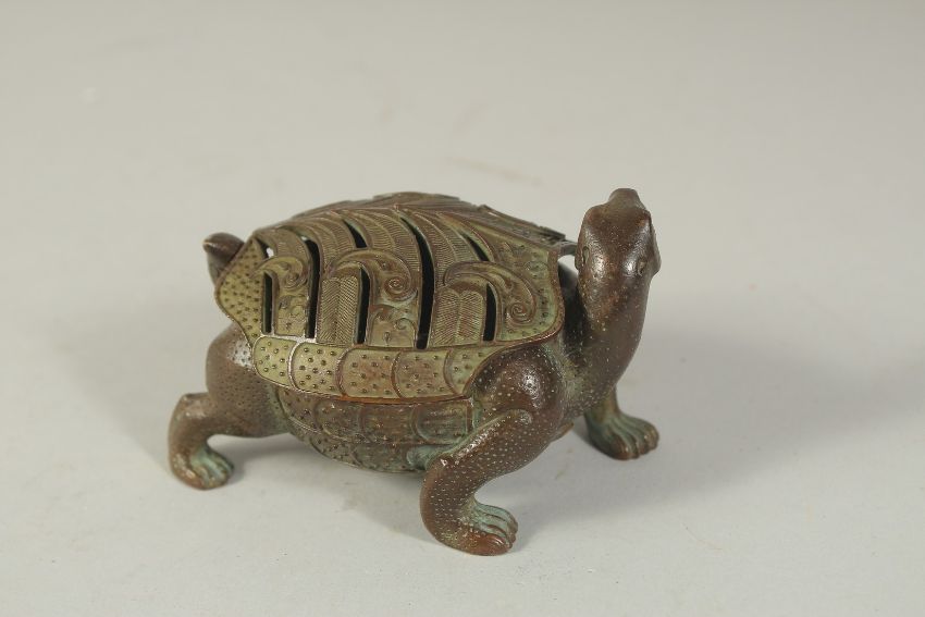 A BRONZE TORTOISE CENSER BURNER, the lid as an openworked shell - lifting off to reveal censer bowl inside, 9cm long.