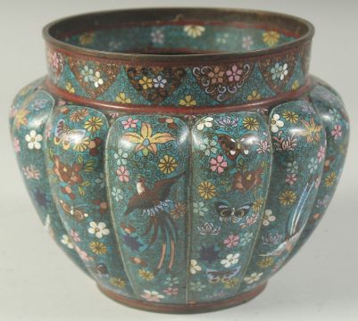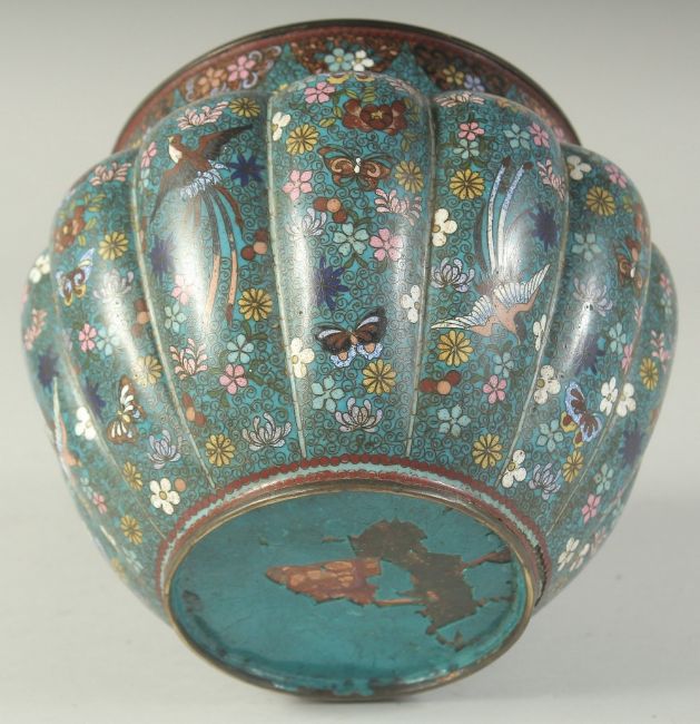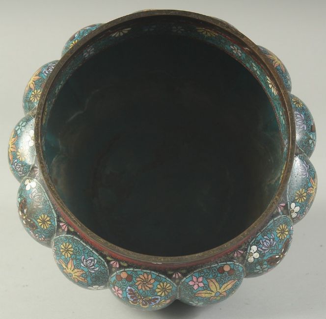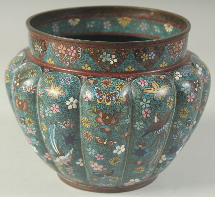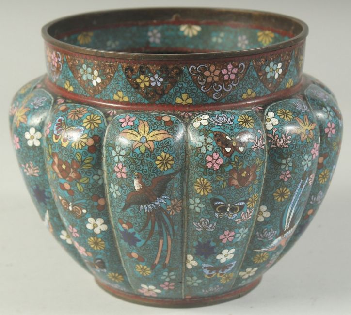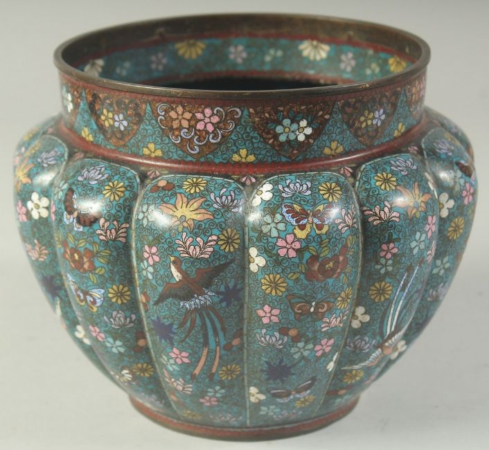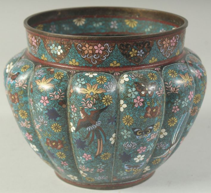 A JAPANESE BLUE GROUND CLOISONNE POT, with lobed body and decorated with birds, butterflies, and flora, 15cm high.