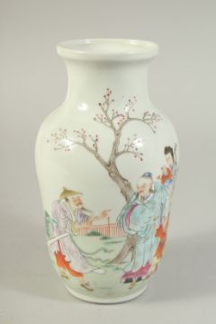 A CHINESE FAMILLE ROSE PORCELAIN VASE, enamel painted with figures in a garden, 21.5cm high.