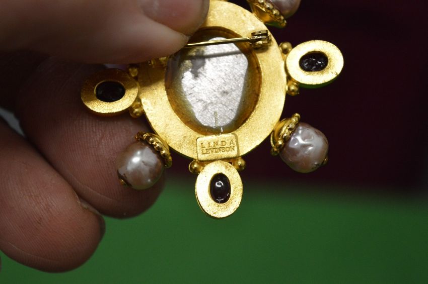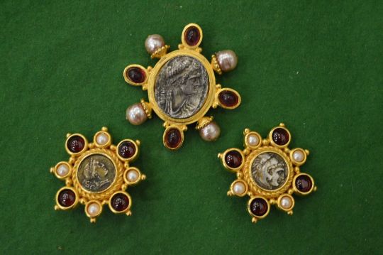 Linda Levinson, a decorative coin inset brooch and pair of matching ear clips.