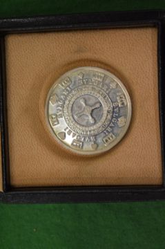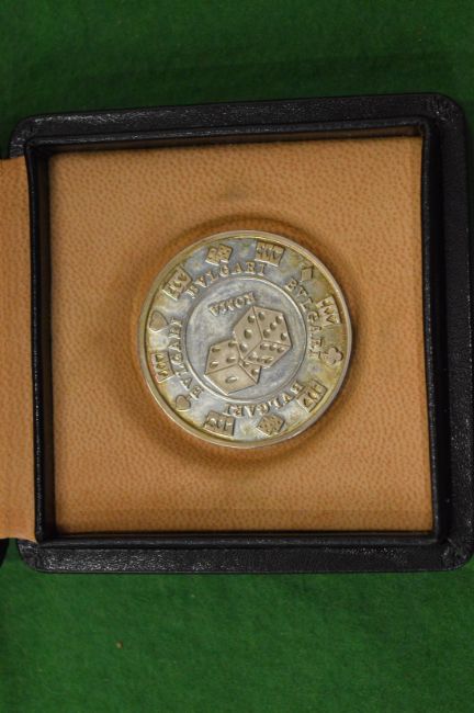 A Bulgari silver gaming chip/coin with original box.