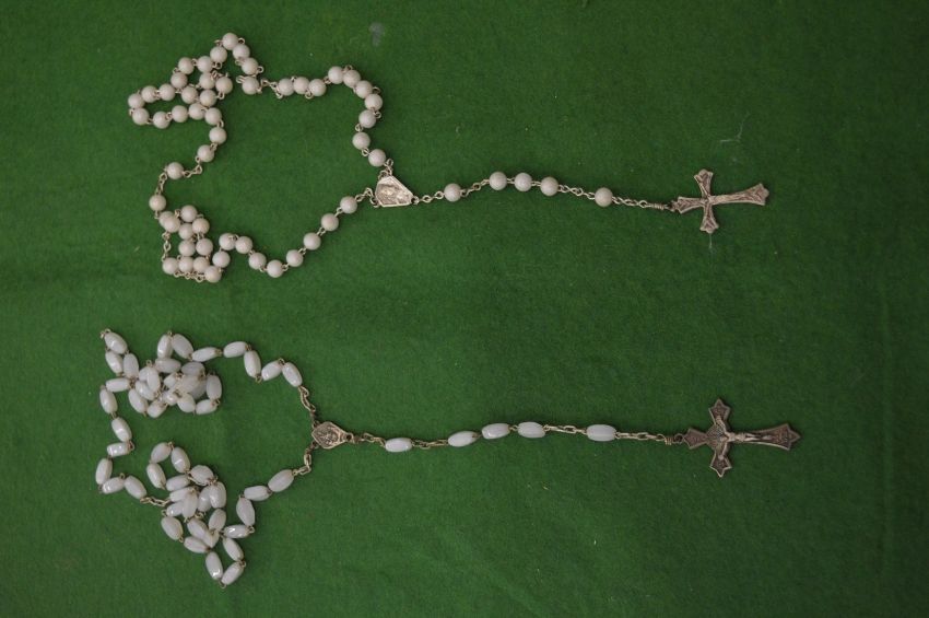 Two rosary necklaces with pearls and white beads.