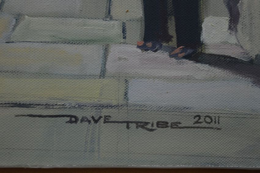 Dave Tribe, London street scene with figures and buses, oil on canvas, signed and dated 2011.