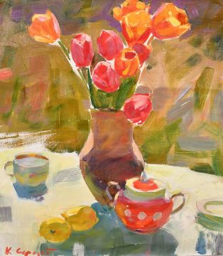 Sergey Kovalenko, 'Tulips', a still life study, oil on canvas, 23.75" x 19.25" (60 x 49cm), unstretched and unframed.