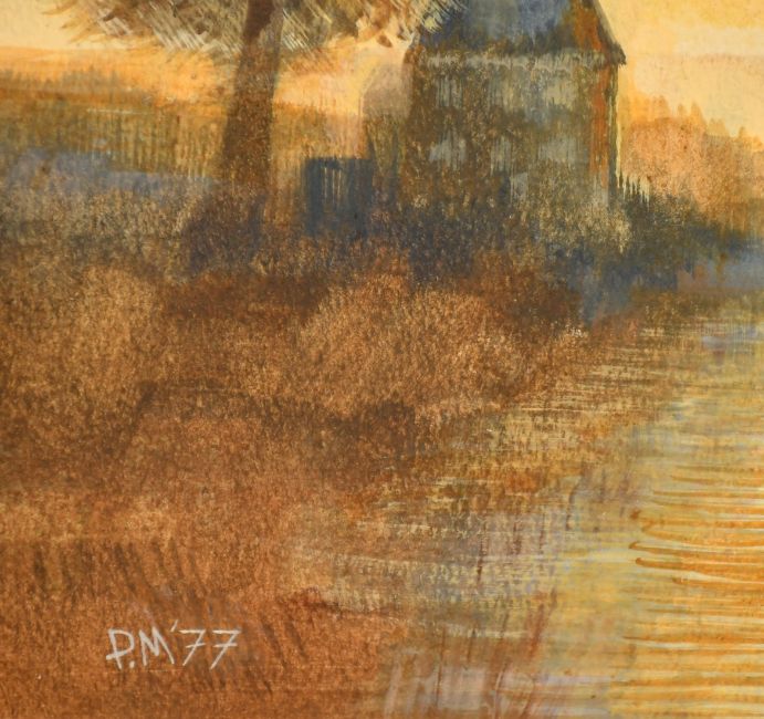 20th Century British School, a watermill by moonlight, watercolour, signed with initials, P.M. and dated 77, gallery stamp on backing board, 10.5" x 14.5" (27 x 37cm).