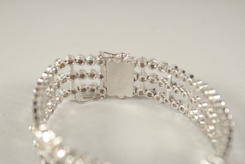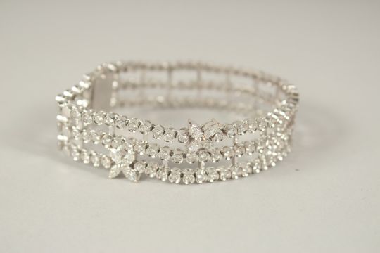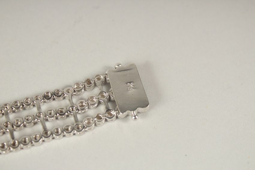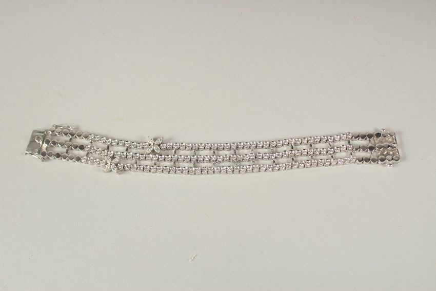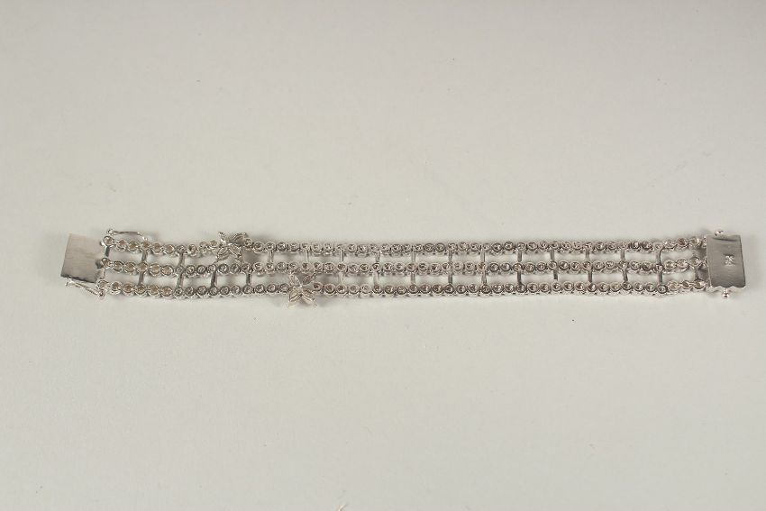A SUPERB RUSSIAN .750 WHITE GOLD THREE ROW BRACELET, set with two flowers.