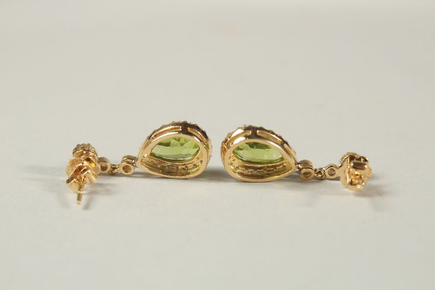 A PAIR OF 18CT YELLOW GOLD DROP EARRINGS SET WITH PEAR SHAPED PERIDOT AND RBC DIAMONDS, boxed.