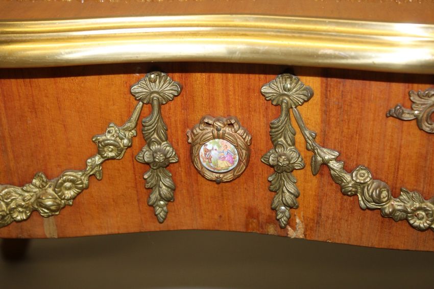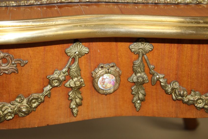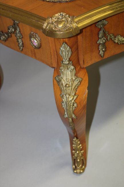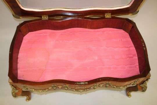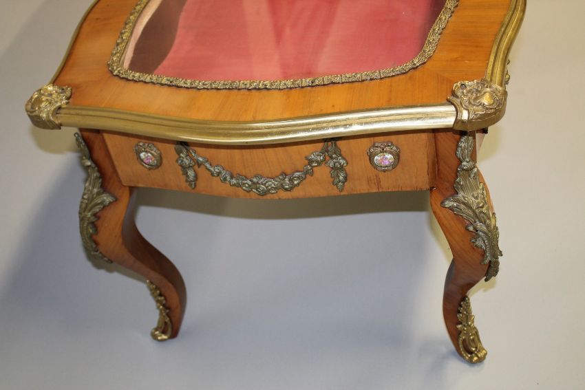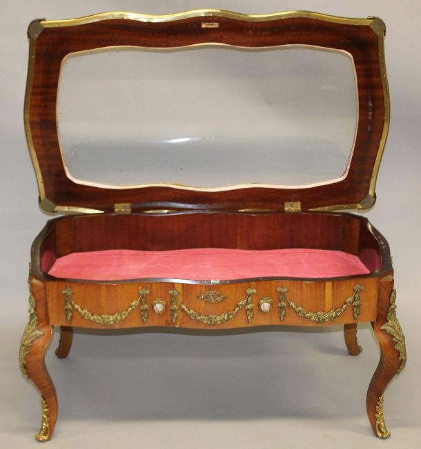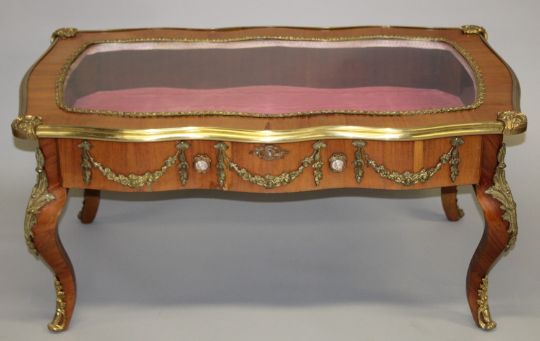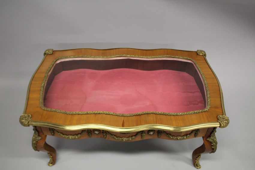 A LOUIS XVITH STYLE KINGWOOD AND ORMOLU TABLE VITRINE with glass top.