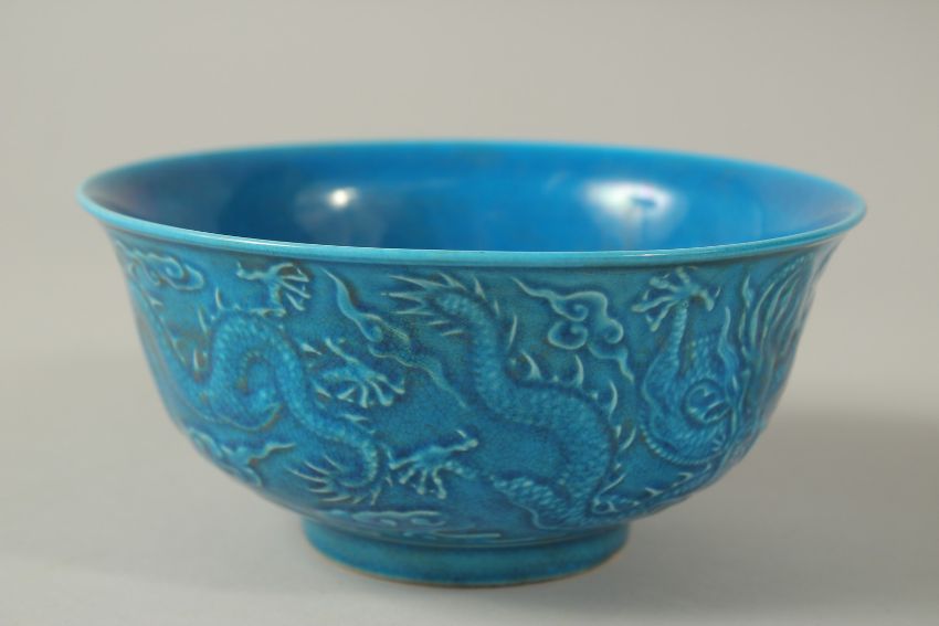 A CHINESE BLUE PORCELAIN BOWL with dragon in relief.