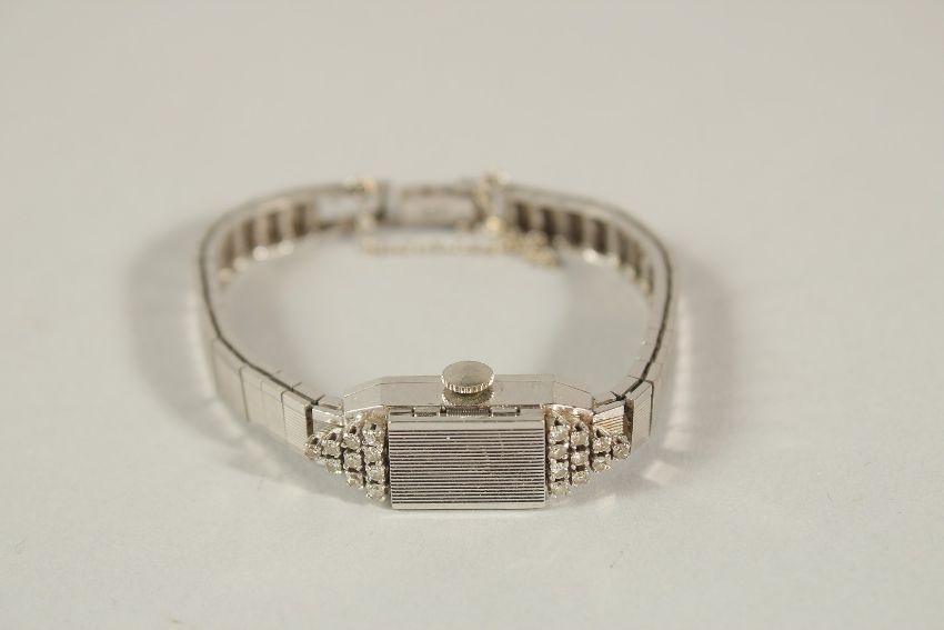A LADIES 14CT WHITE GOLD AND DIAMOND COCKTAIL WATCH.