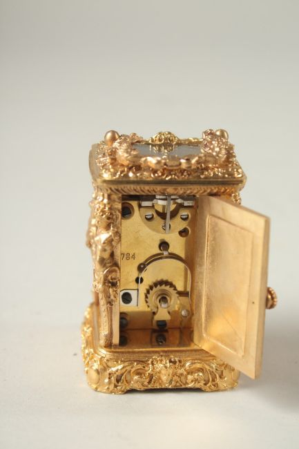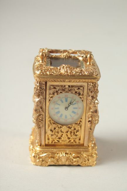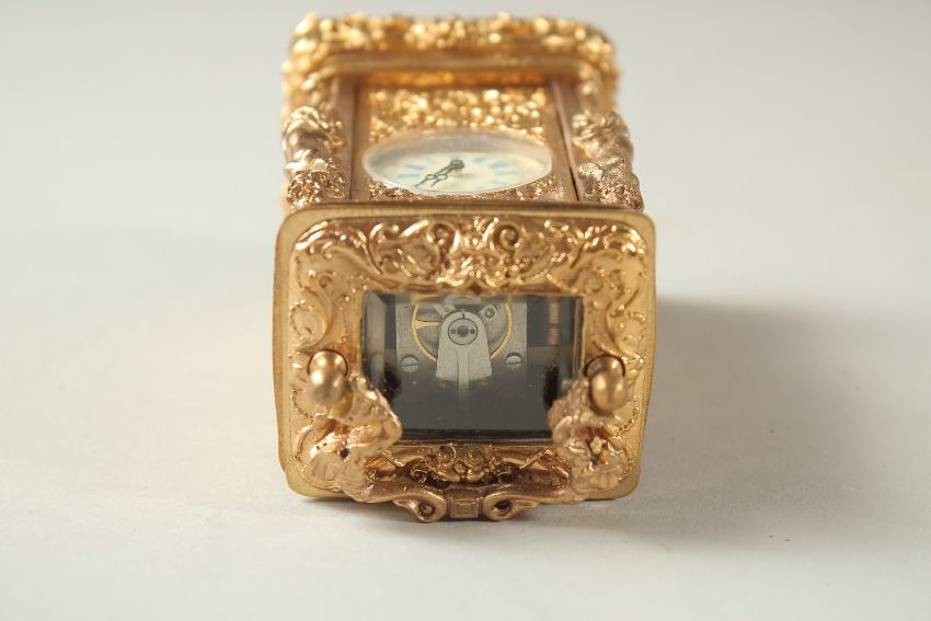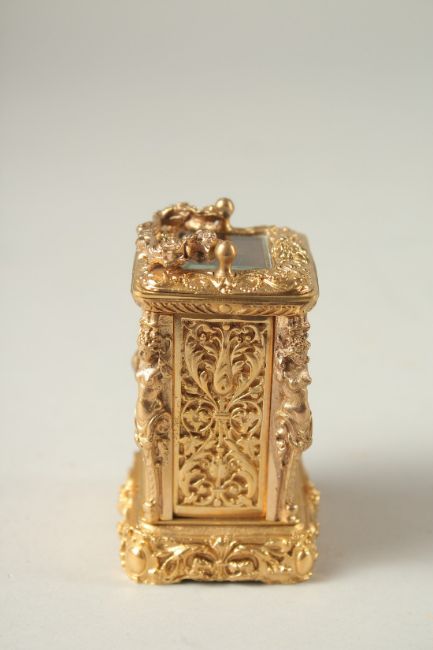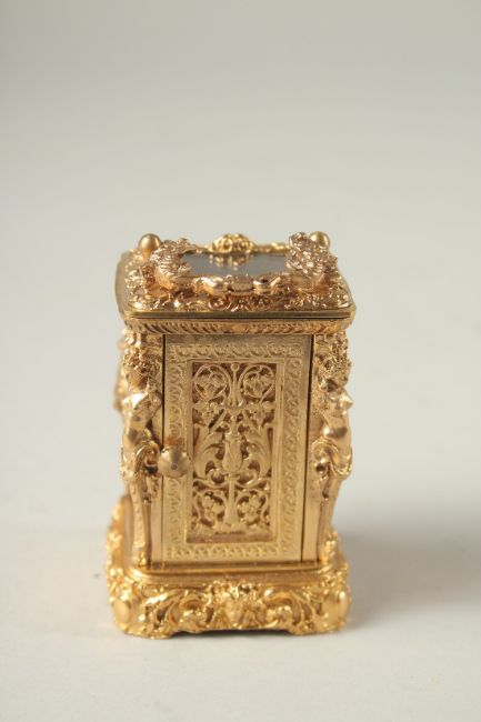 A CAST GILT MINIATURE CARRIAGE CLOCK with female figures.
