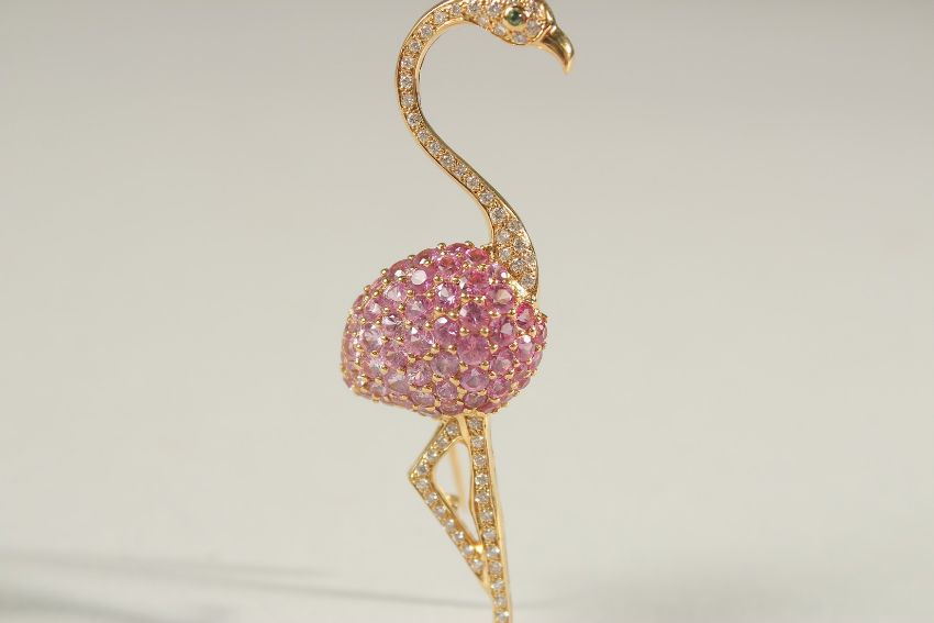 AN 18CT YELLOW GOLD, SAPPHIRE AND DIAMOND FLAMENCO BROOCH.