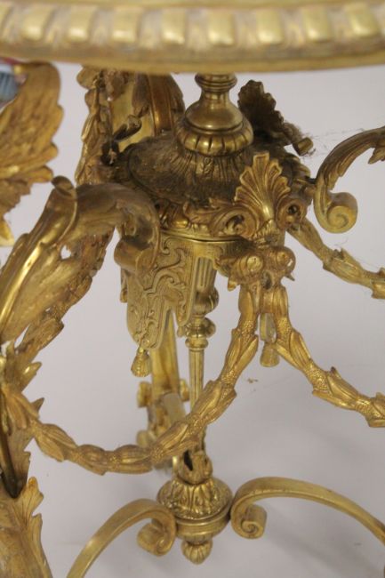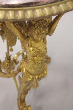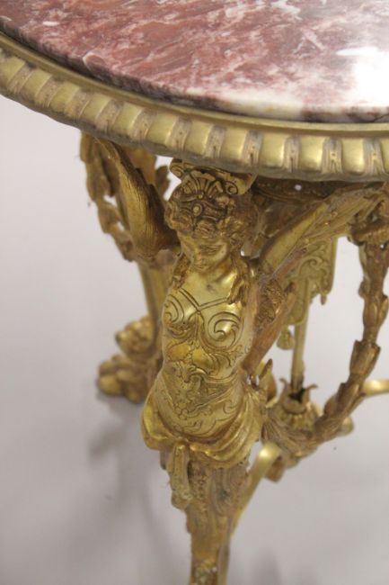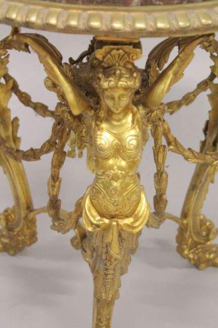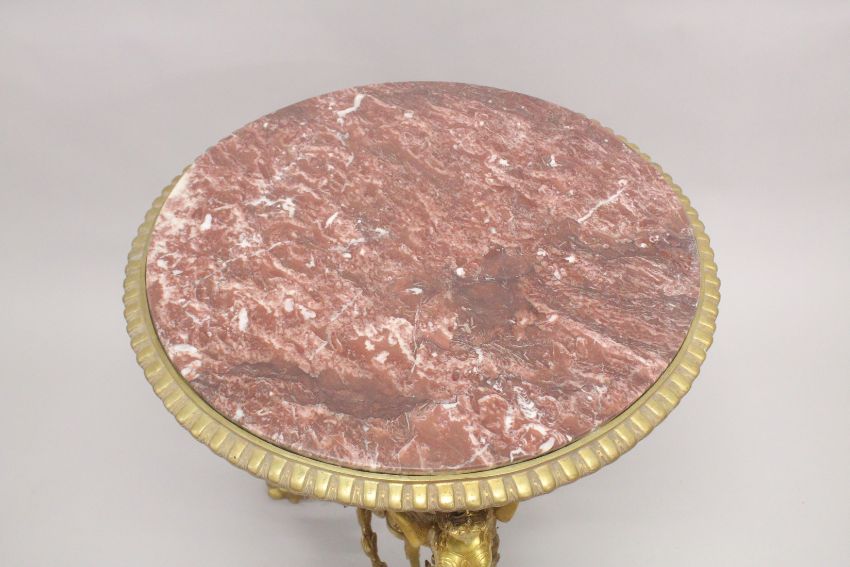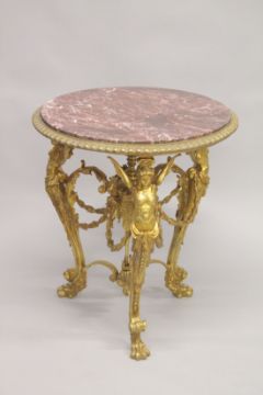 A GOOD EMPIRE DESIGN CIRCULAR GILT BRONZE MARBLE TOP TABLE with three winged classical figures support and garlands.